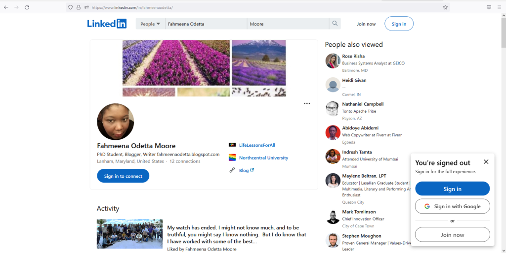 I am still working on my second LinkedIn page (https://www.linkedin.com/in/fahmeenaodetta/). I pretty much dumped data in the profile and am working to organize it all.