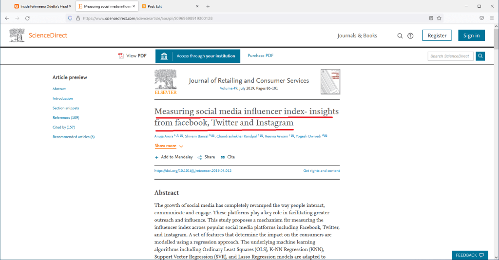 I found an interesting journal article (Arora, Bansal et al, https://www.sciencedirect.com/science/article/abs/pii/S0969698919300128) that developed an Influencer Index for social media. The use of the word ‘index’ caught my attention. It made me think of indices in finance such as the Dow Jones or S&P 500. The influencer index discovers influencers on social media networks. Will this lead to something?