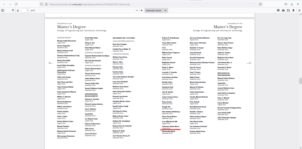 I found the 2010 UMBC Winter Commencement document online (at: https://contentdm.ad.umbc.edu/digital/api/collection/UPUB/id/7857/download). I am listed as a candidate for the Master’s Degree from the College of Engineering and Information Technology on page 17 (see below). I actually missed my graduation/commencement ceremony, but I did graduate.