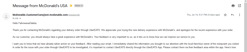 McDonald’s responded adequately to my complaint:
