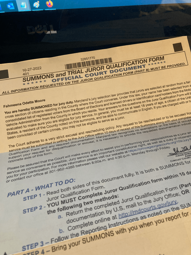 “Fahmeena Odetta Moore You are hereby summoned for jury duty….”