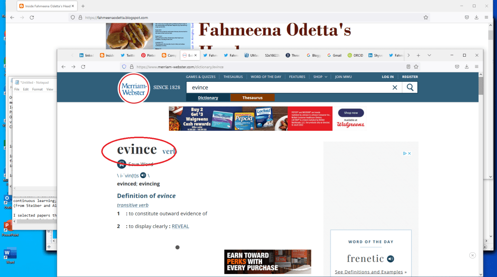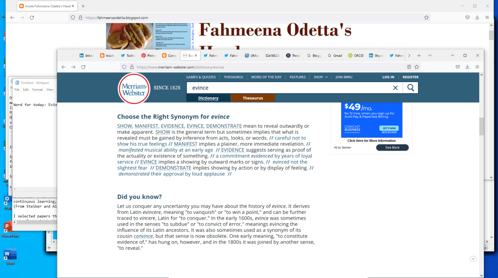 I like the explanations provided with the definition of the word, especially the first section showing the synonyms. There are many synonyms (such as show, manifest, and evidence) that all mean ‘to reveal outwardly or make apparent.’ However, there are slight variations in the meanings.