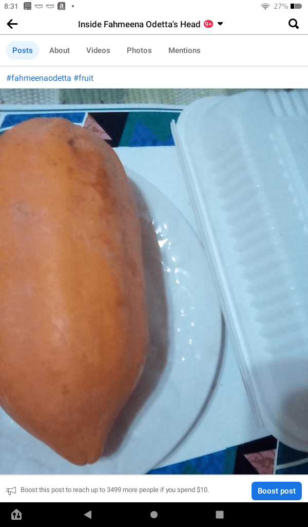 The fruit I eat are usually store-bought. In stores, there is a lot of fruit available for easy purchase – displayed well and at a fair price. As expected, fruit is “from the original source” fresh (the equivalent of farm-fresh) if picked from a tree. I remember there was much fruit-picking by children in Linden when I was young. Young Fahmeena picked fat pork and other fruit (climbing the tree was usually out of the question – I prefer to get fruit within reach or low hanging fruit).