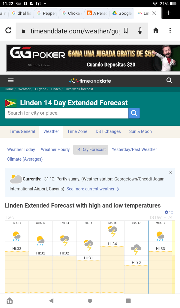 Good morning from Linden, Guyana (in the smallest county Demerara)! The temperature is reported to be 31 degrees Celsius -weather provided by timeanddate.com (https://www.timeanddate.com/weather/guyana/linden/ext).