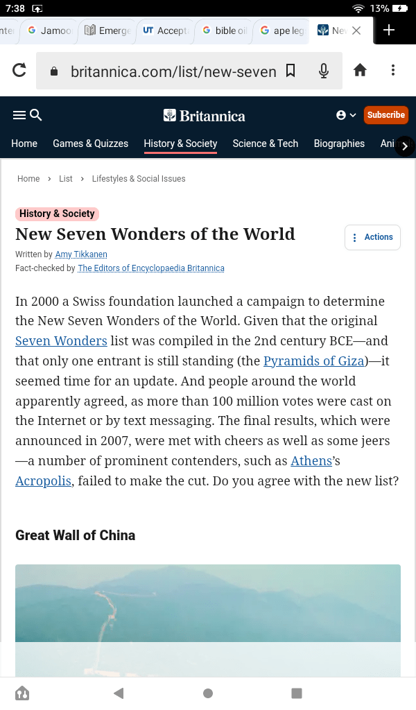An interesting article on the seven wonders of the world: https://www.britannica.com/list/new-seven-wonders-of-the-world. The article informs that there was an update to the original seven wonders of the world in 2007. It was a long update process – a Swiss foundation started the campaign in 2000; the final list was compiled seven years later (in 2007). It appears that people around the world may have provided input into the need for an update. Or was it input for the development of the final list? The author could have made this clearer.