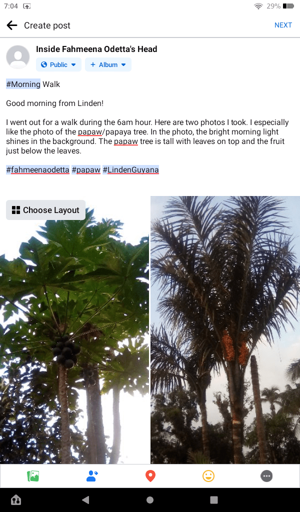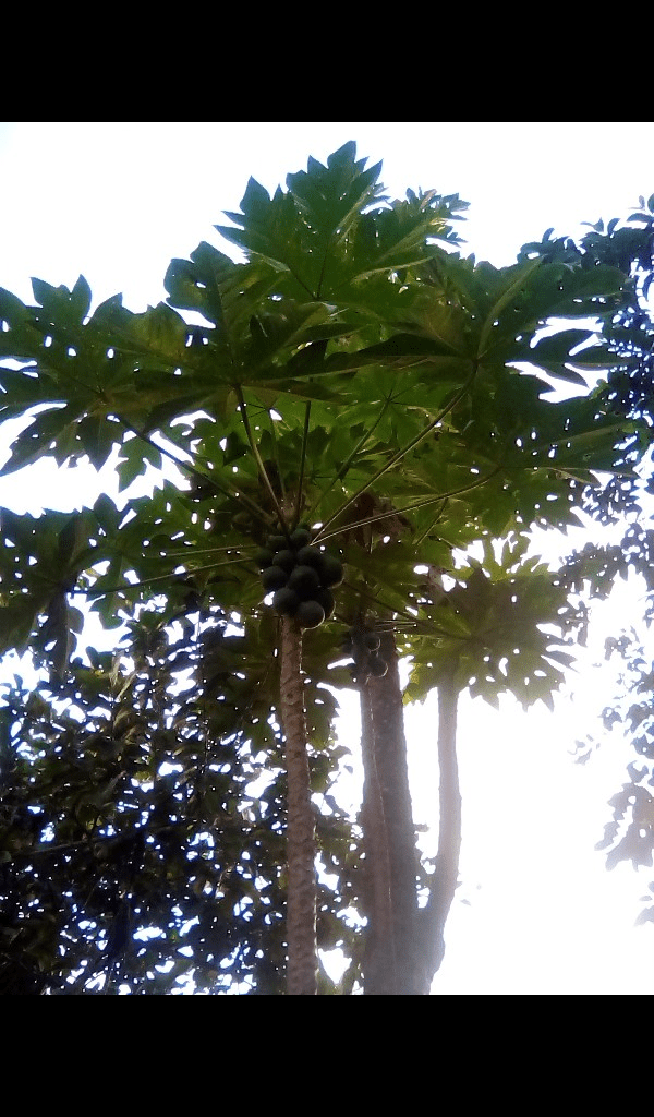 I went out for a walk during the 6am hour. Here are two photos I took. I especially like the photo of the papaw/papaya tree. In the photo, the bright morning light shines in the background. The papaw tree is tall with leaves on top and the fruit just below the leaves.