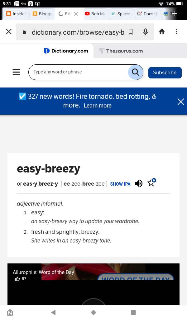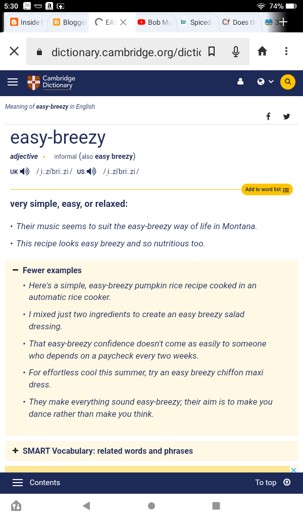 ‘Easy-breezy’ is a word in the dictionary – a word that has a hyphen. I recall that it was used in ads for CoverGirl, but it is reported to be a word not used much in written English (see below). It is the word for today.