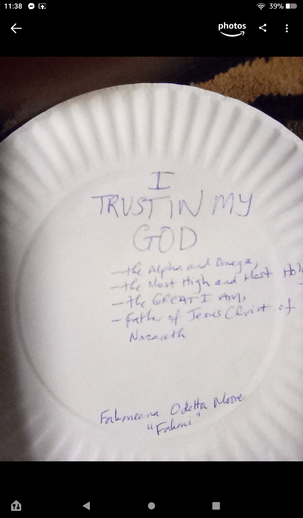 Recently, I used paper plates instead of a book for my poems and I like it! I created the ‘plate art’ below that shows “I trust in Almighty God” when I created the poems. I didn”t have a marker. I used what I had.