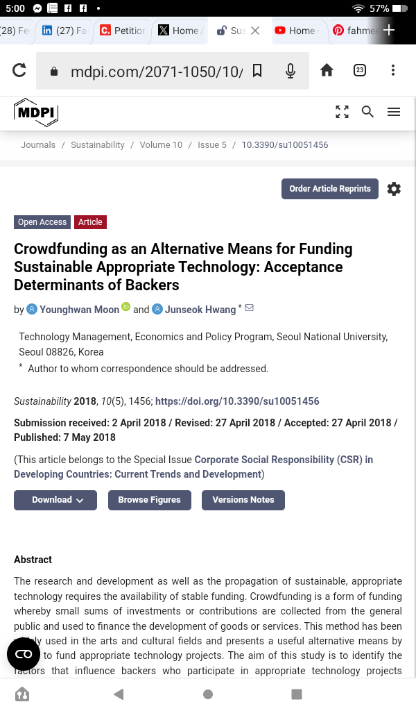 I found an interesting and informative article that presents research on the factors that cause the funding of technology projects using crowdfunding in Korea. It was good that the researchers decided to focus on appropriate technology projects only and to compare them to other types of projects. The researchers used a theory derived from the Theory of Reasoned Action (the Unified Theory of Acceptance and Use of Technology) as well as prior research to come up with factors that might influence backers to fund technology projects. Factors included: expected performance gains from the project, the ease of investing in the project (the effort needed), the existence of appropriate infrastructure for the project, the influence exerted by others especially important people in their reference group (social influence), perceived trust, and perceived risk. The factors social influence and effort expectancy had the largest effect. Read the findings here: https://www.mdpi.com/2071-1050/10/5/1456.
