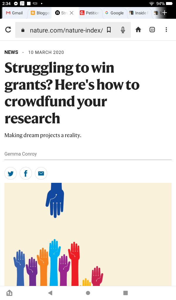 I was not aware that researchers are turning to crowdfunding to fund their research. (This article provided the information that researchers are gathering donations from the general public to fund their research: https://www.nature.com/nature-index/news/how-to-crowdfund-your-research-science-experiment-grant). It is a great idea, but I know some people “look down” on those who ask friends and the general public for funds for a personal or professional reason. I am not certain I want to join in this funding trend. I will continue trying for grants.