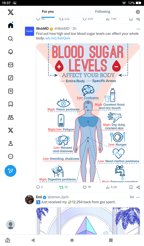Incidentally, WebMD posted on low and high blood sugar levels today on Twitter/X. I had higher-than-normal blood glucose levels (pre-diabetes) in the past. Not anymore.