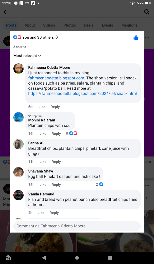 In primary school (in Guyana), snack referred to food for lunchtime. My mother prepared my snack each day then packed the snack in my lunch kit (lunch box) for me to take to school. My snack was usually five-finger drink and coconut buns (not cross buns). I did not enjoy it. Now, snack is food I eat between meals or when I feel the need to augment a light meal. I like to snack on food such as pastries, salara, plantain chips, and cassava/potato ball. For some of these foods, the snack goes well with a bottle of “sweet drink” (soda) or a glass of homemade drink.
