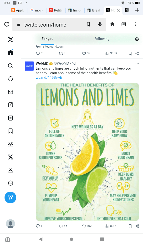 Incidentally, I saw a post on the benefits of lemons and limes by WebMD just a few minutes ago. I posted about lemons just a few hours ago. The diagram/chart in the post from WebMD showed some interesting benefits of both limes and lemons. I was surprised by some of them. I did not expect to see benefits such as keep gums healthy, boost your brain, and help your baby grow.