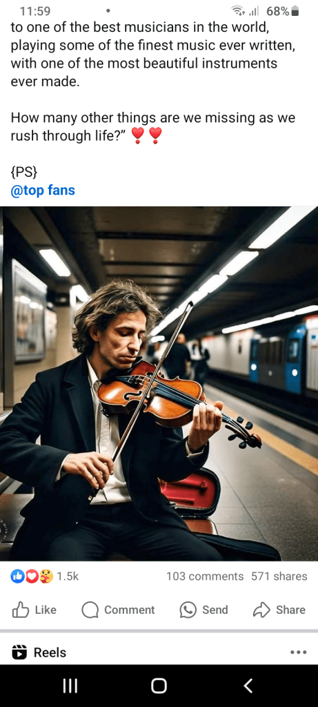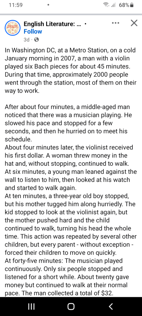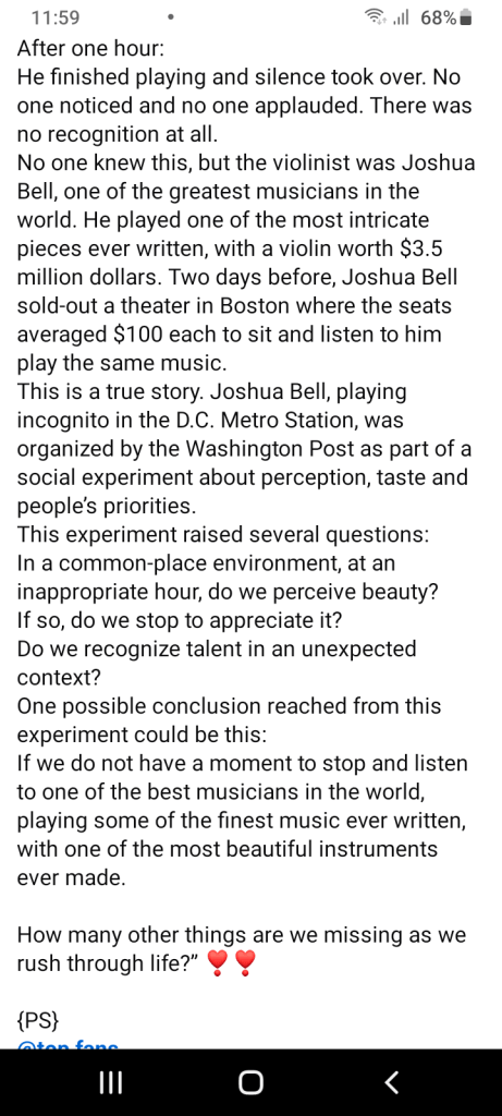 Would I stop and appreciate a beautiful thing? That is what I asked myself as I read the piece on an experiment at a DC metro station. No one treated the world-class musician playing beautiful music in the metro station as he should be treated. A group of people gathering around him applauding as he played would have been nice. It seems cruel but people were just busy. Everyone rushed by without stopping to appreciate him. This all makes me think advertising is necessary. People must be made aware of other people’s talents and background so that they know what they are experiencing.