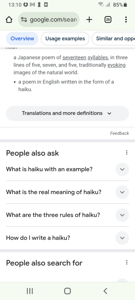 The search provided good information on the Japanese short form poetry. I ended up clicking on ‘What is haiku with an example’ in the ‘People also ask’ section for additional information. I like to review the information on what other people searched for that Google provides.
